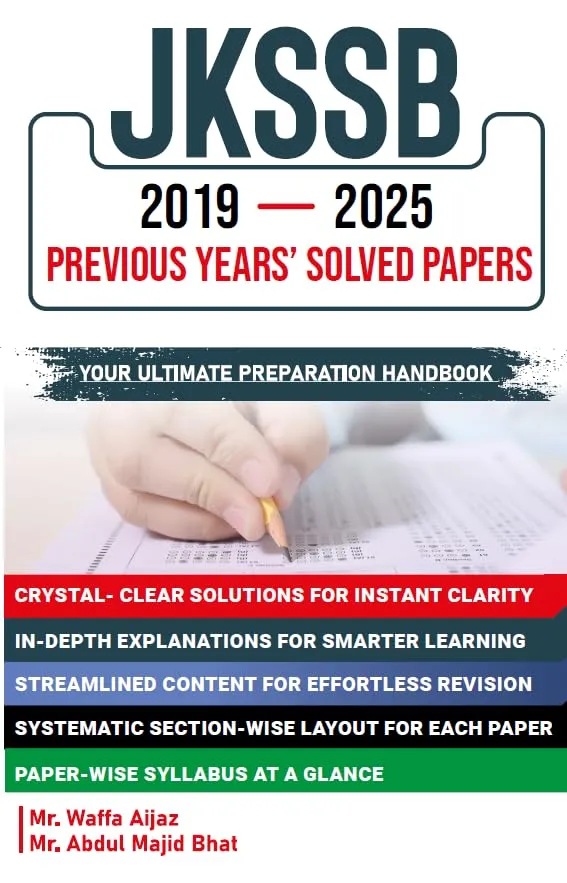 JKSSB Previous Years Solved Papers 2019β2026 is a complete practice book specially designed for aspirants preparing for JKSSB and JKPSC exams in Jammu & Kashmir. This book includes real exam papers from 2019 to 2026 with detailed solutions, helping candidates understand the exact exam pattern, difficulty level, and important topics.